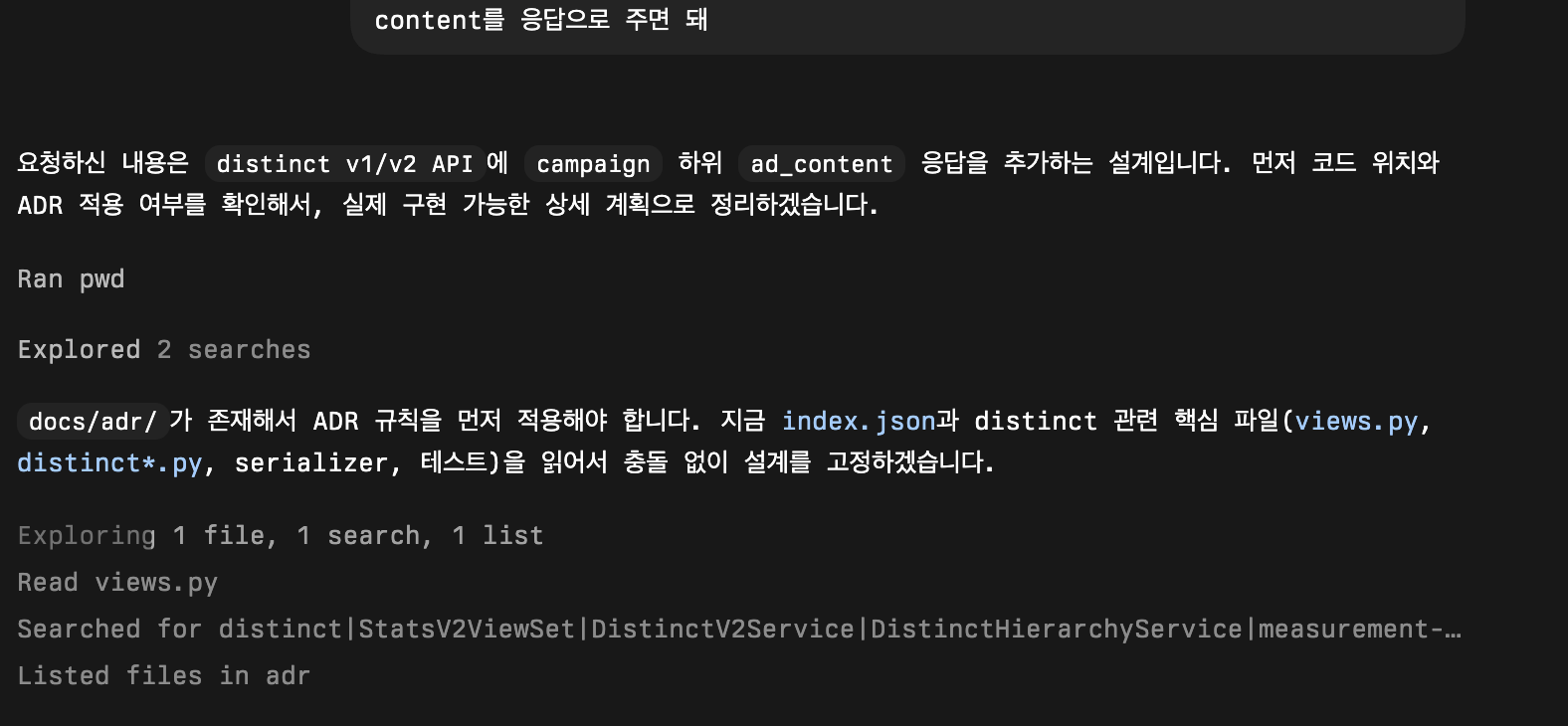 번거로운 컨텍스트 주입 작업이 눈에 띄게 줄었습니다. 비슷한 작업을 반복할 때, 마치 숙련된 인간 동료와 일하는 것처럼 에이전트와 저 사이에 '암묵적인 싱크'가 맞춰져 있다는 느낌을 받았습니다. 특히 에이전트가 `plan` 모드에서 기존 ADR을 참고해 설계를 제안할 때 그 효용성이 극대화되었습니다.