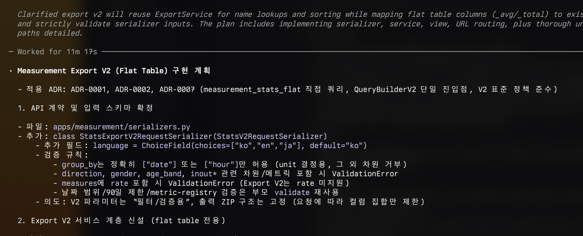 제가 직접 관여하지 않았던 모듈을 개발할 때도 에이전트는 ADR 문서를 기반으로 훌륭하게 워킹했습니다. 아직은 최종 확인 후 담당자에게 토스하고 있지만, 시스템이 고도화된다면 이 과정조차 자동화될 수 있다는 가능성을 보았습니다.